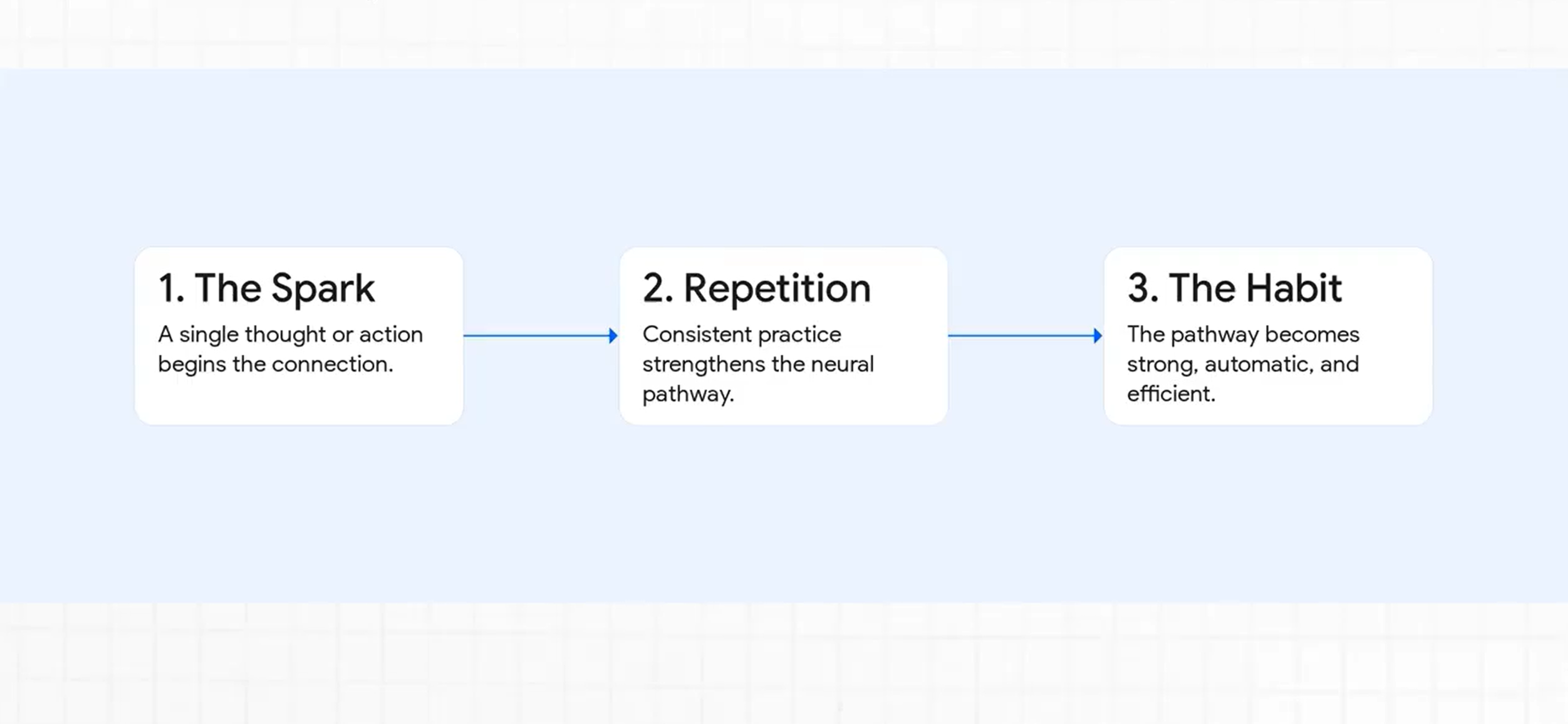 Every time you have a thought or take an action, you’re creating a connection between brain cells. The more often you repeat it, the stronger that connection becomes. Over time, it turns into an automatic habit or belief.